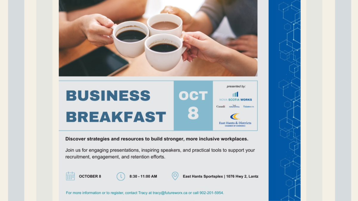 Join the East Hants & Districts Chamber of Commerce and Futureworx Nova Scotia Works for a free Employer Business Breakfast.
